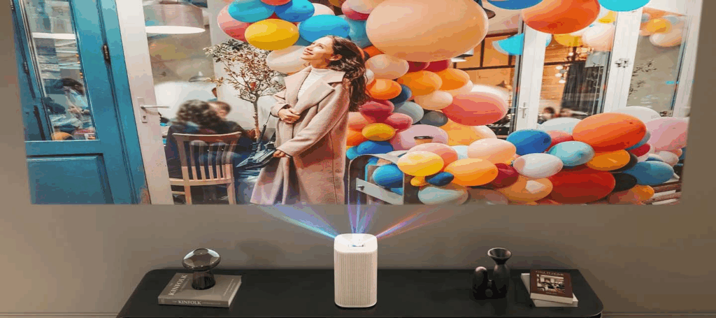 - Space‑shifting: up to a 100″ Full HD image from inches away — tap, swipe, and play on walls, tables, or floors.
